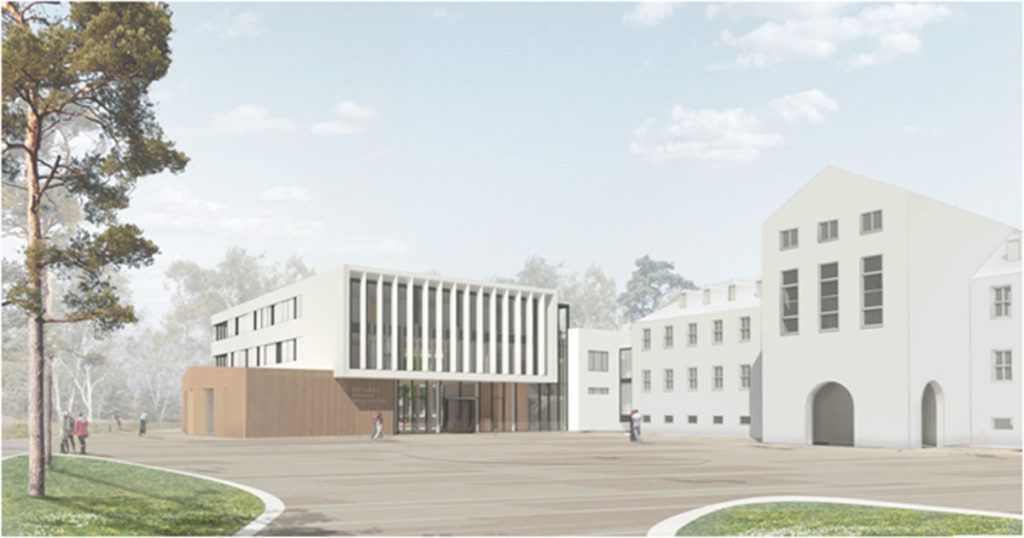 Ein modernes, weißes, mehrstöckiges Gebäude mit vertikalen Fensterlamellen steht neben älteren, weißen Gebäuden auf einem offenen, weitläufigen Platz, auf dem nur wenige Menschen unterwegs sind.
